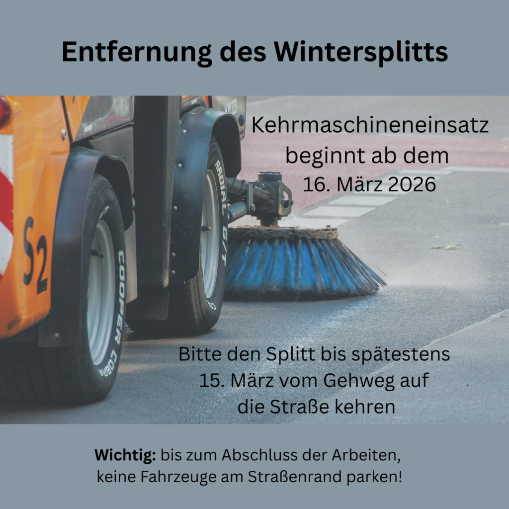 Zusätzlich möchten wir darauf hinweisen, dass ab dem 16. März 2026 bis zum Abschluss des Kehrmaschineneinsatzes keine Fahrzeuge am Straßenrand parken sollten, da diese den reibungslosen Ablauf der Kehrmaschine erheblich behindern können.